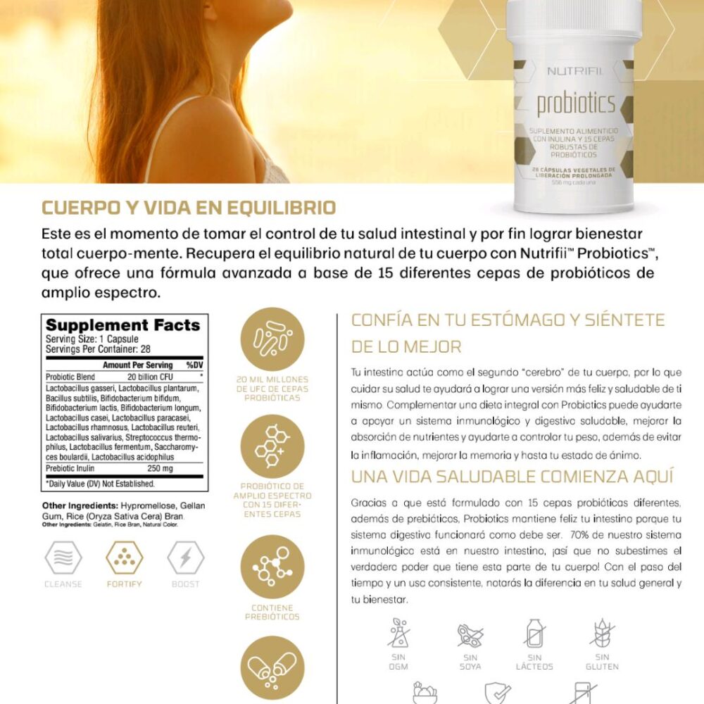 Este es el momento de tomar el control de tu salud intestinal y por fin lograr bienestar total cuerpo-mente. Recupera el equilibrio natural de tu cuerpo con Nutrifil» Probiotics», que ofrece una fórmula avanzada a base de 15 diferentes cepas de probióticos de